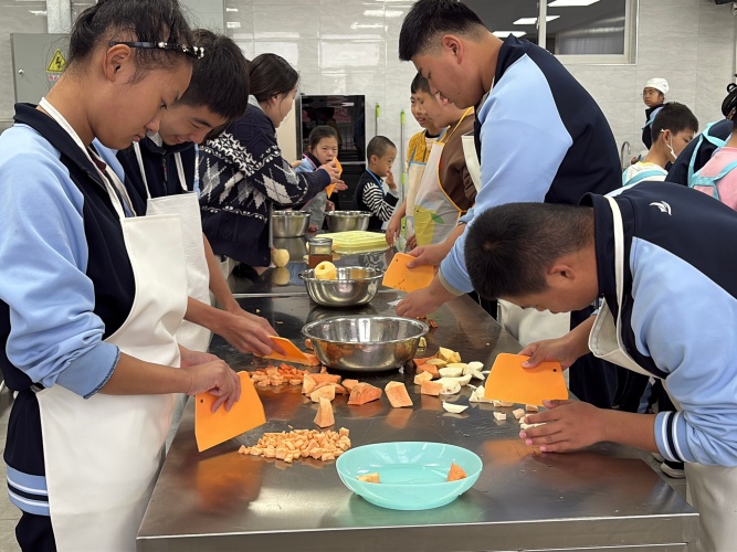 洗薯刮皮、切塊拌料、鋪料入箱……同學(xué)們圍站操作臺前,分工協(xié)作完成地瓜蘋果派的制作:有人細(xì)致削皮切塊,有人混合蛋液與食材,有人將餡料均勻鋪在烤盤上。